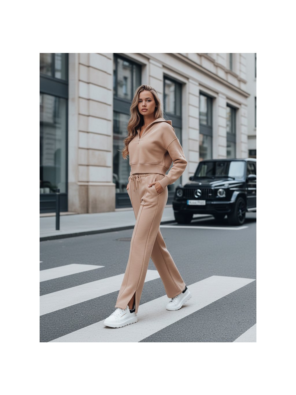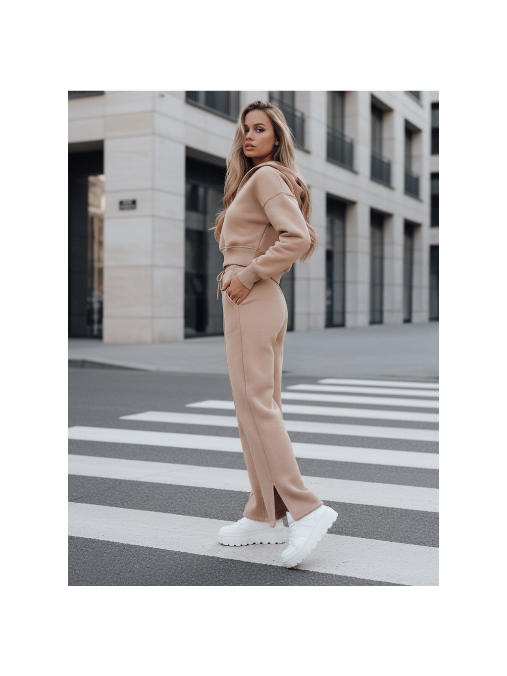 Pohodlná béžová tepláková souprava s mikinou a rovnými kalhotami