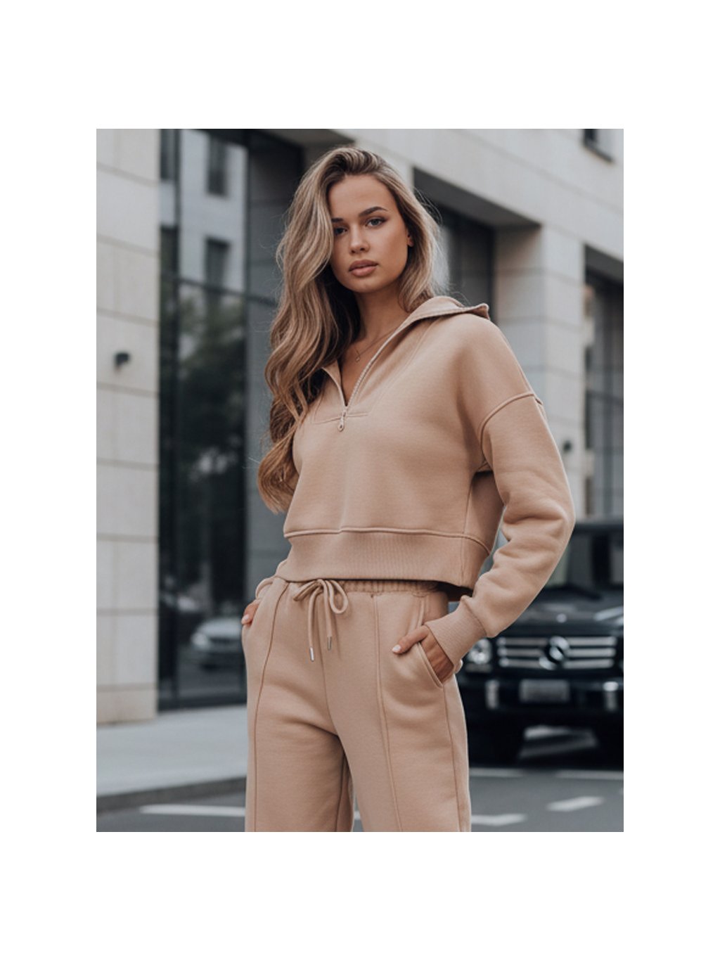 Dámská tepláková souprava MARINO spojuje pohodlí s čistým, moderním stylem. Set se skládá z mikiny s krátkým zipem a kapucí a kalhot s rovnými nohavicemi, které zajišťují pohodlí při nošení i hezkou siluetu.
