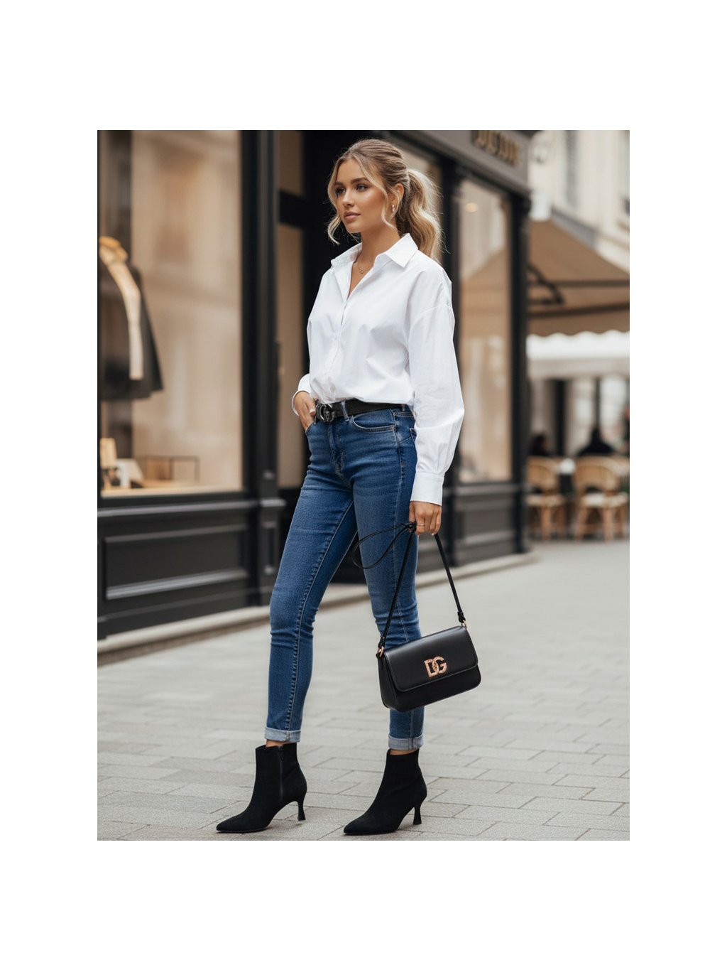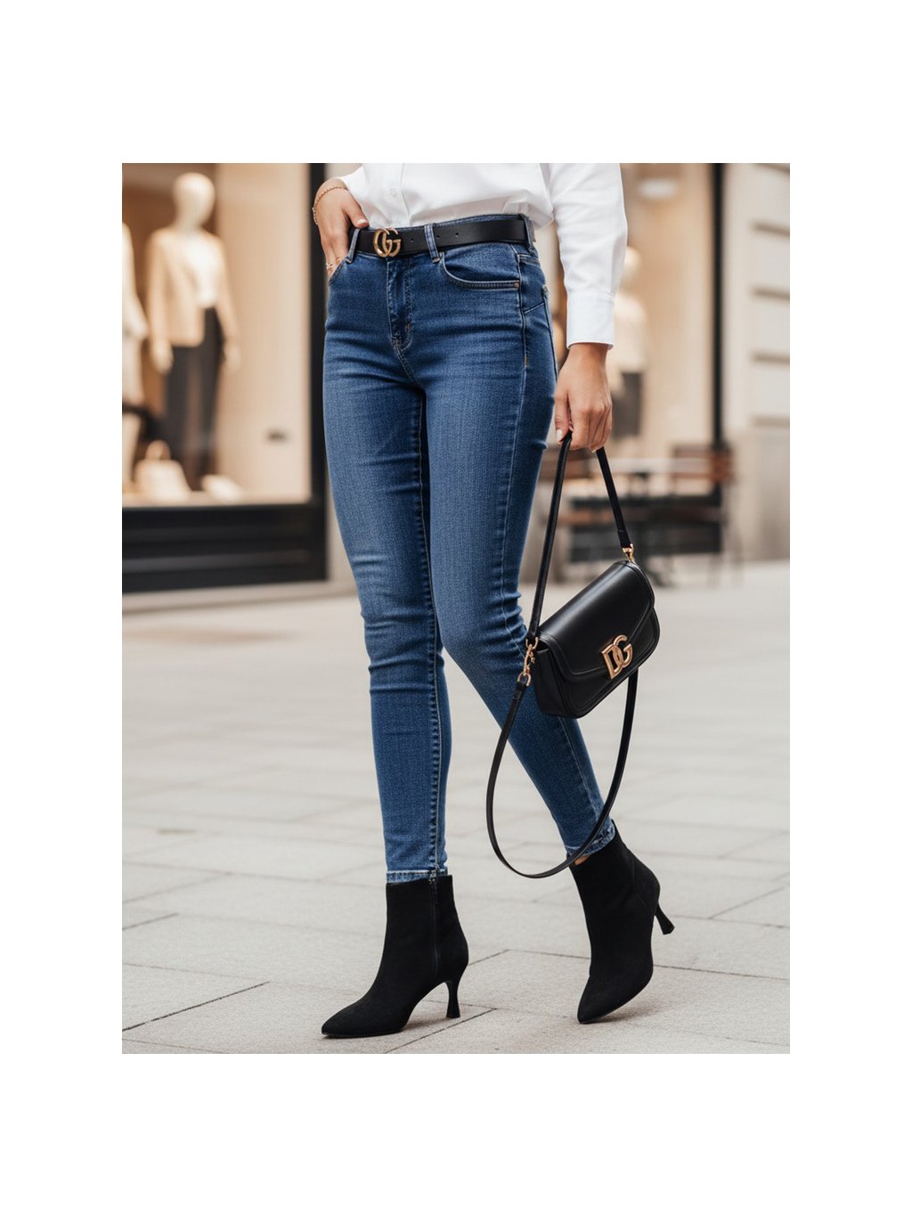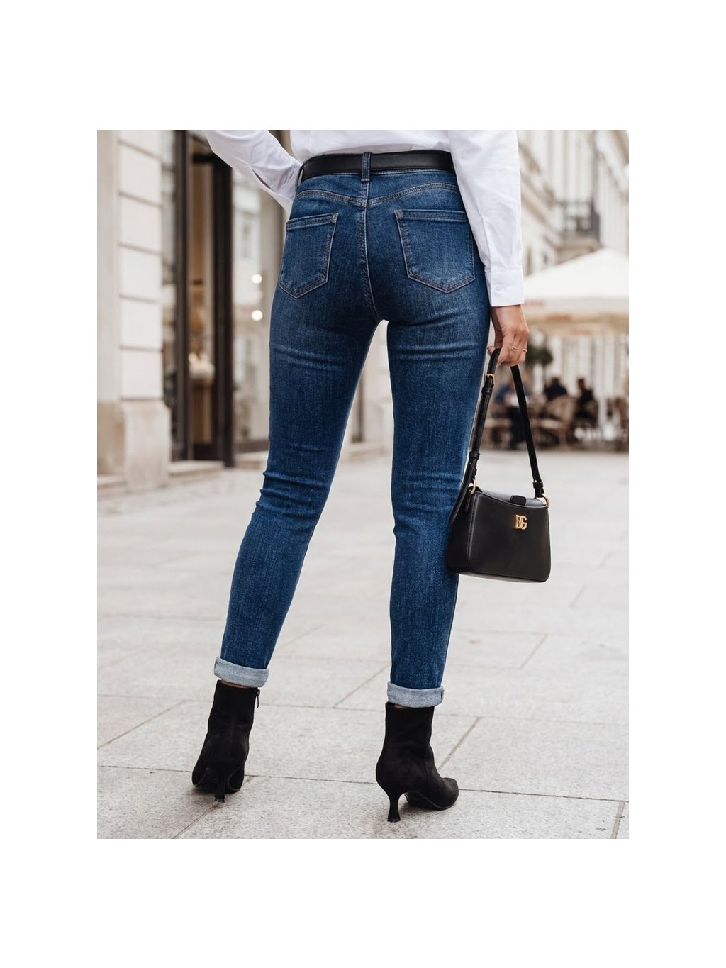 Úzké džíny z elastického materiálu, které perfektně sedí, tvarují postavu