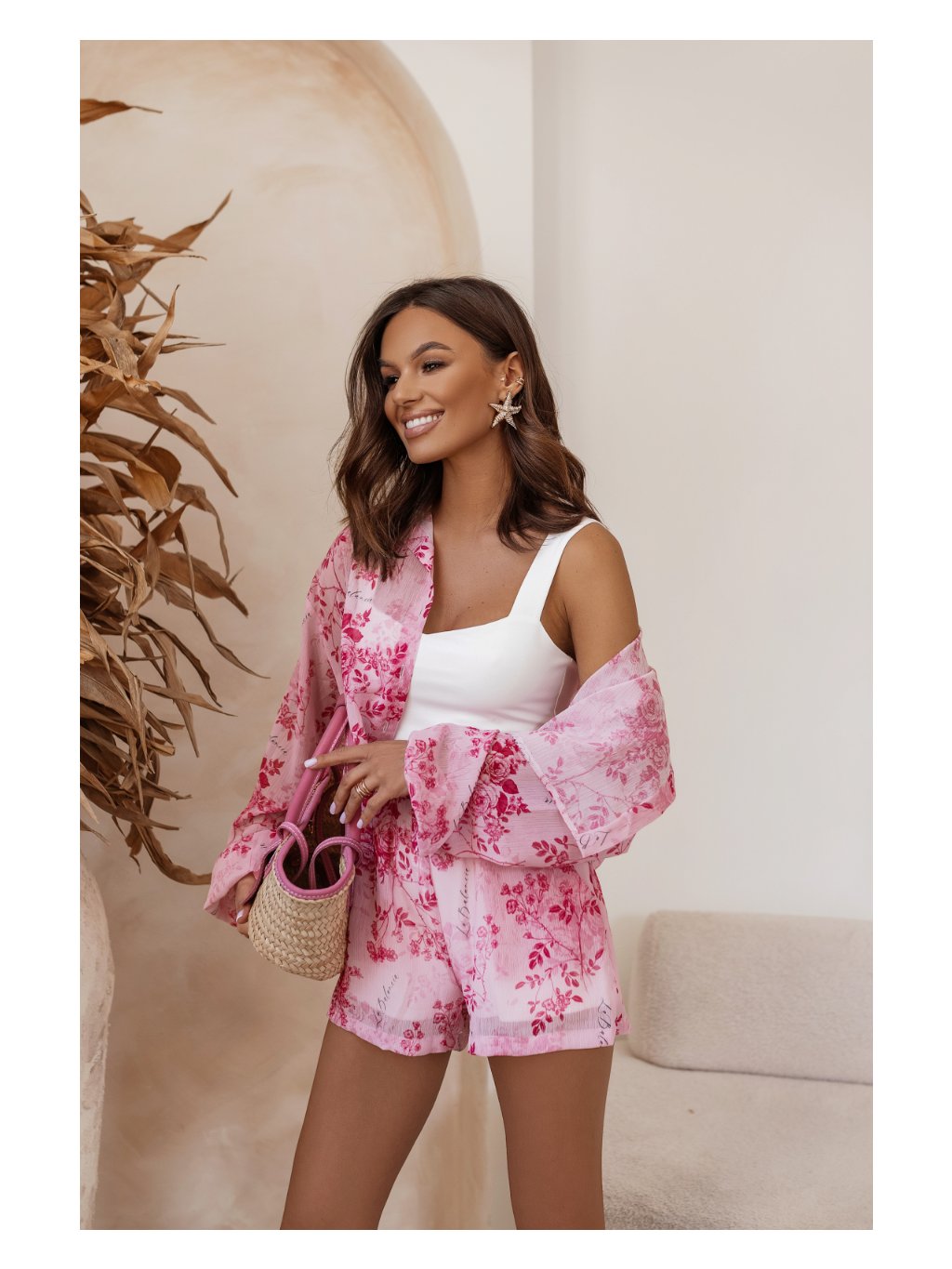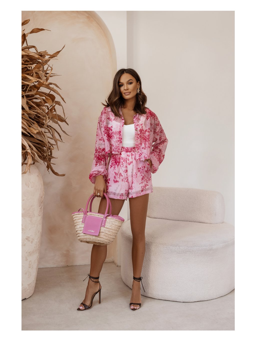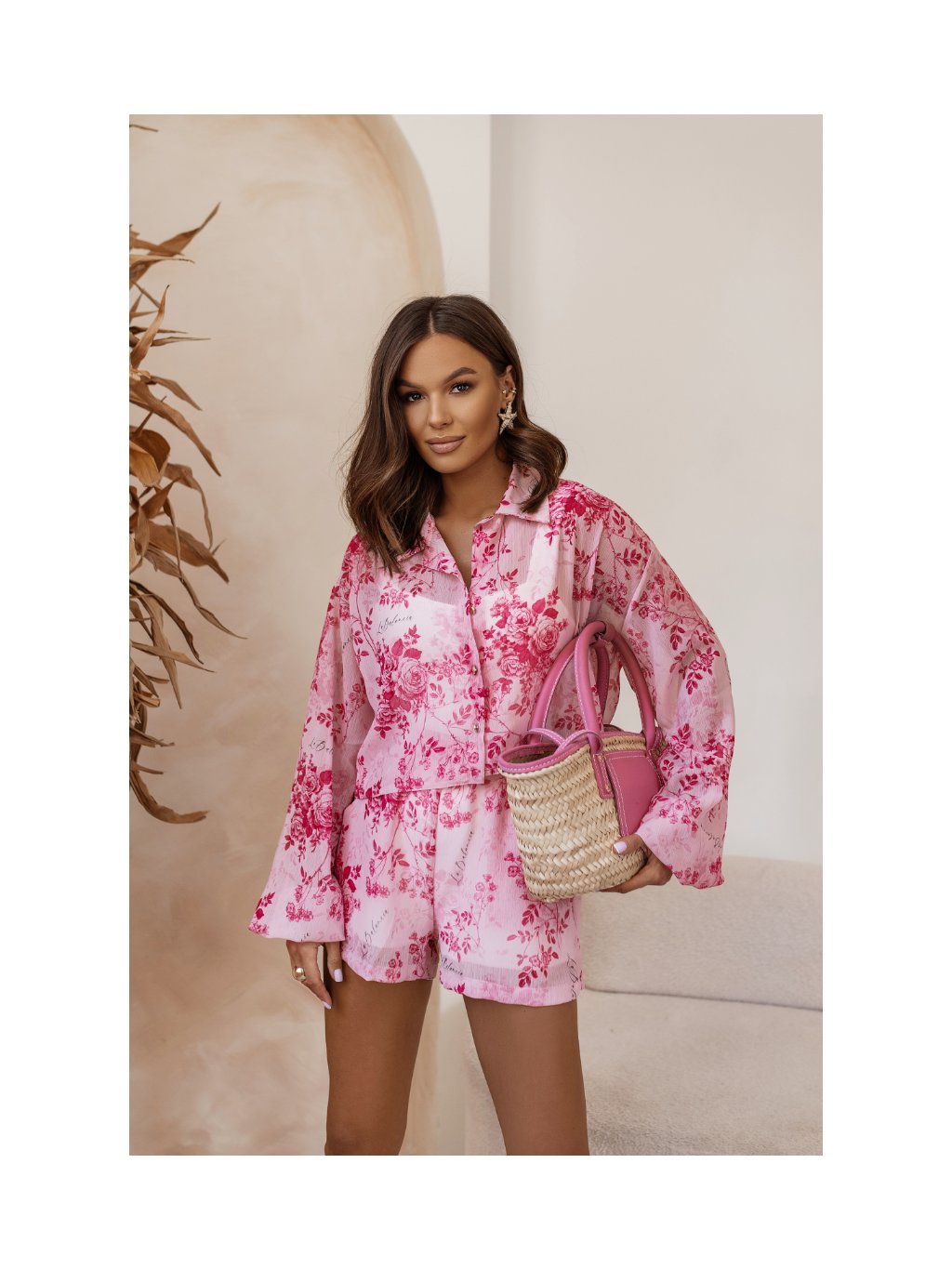Košile: Lehounká, s dlouhým rukávem a zapínáním vpředu, přidává tomuto kompletu sofistikovanost. I přes svou lehkost je lehce průhledná, což dotváří hravou letní atmosféru.